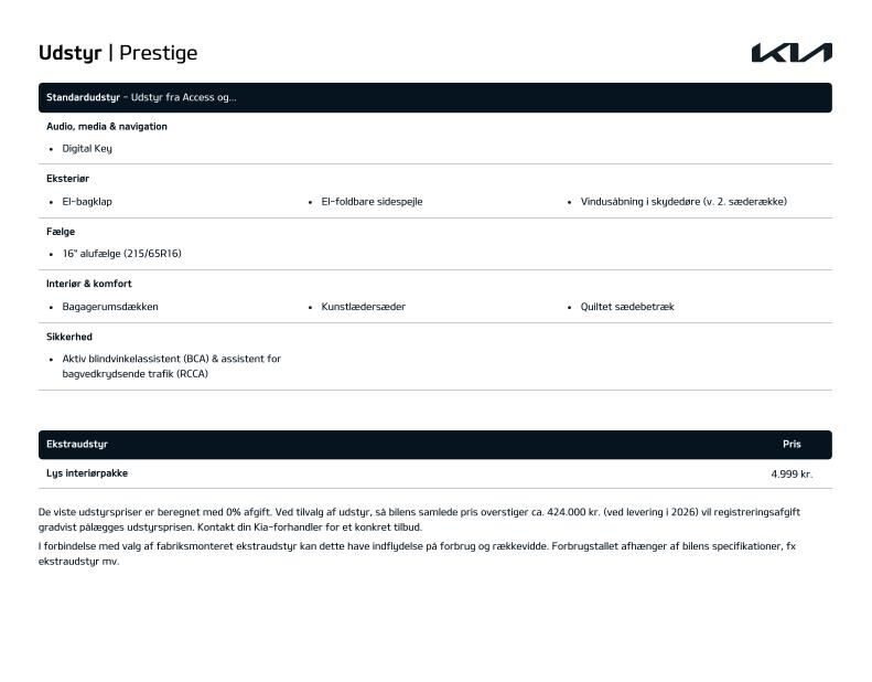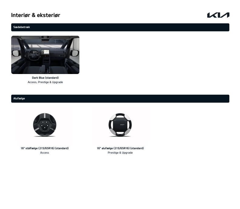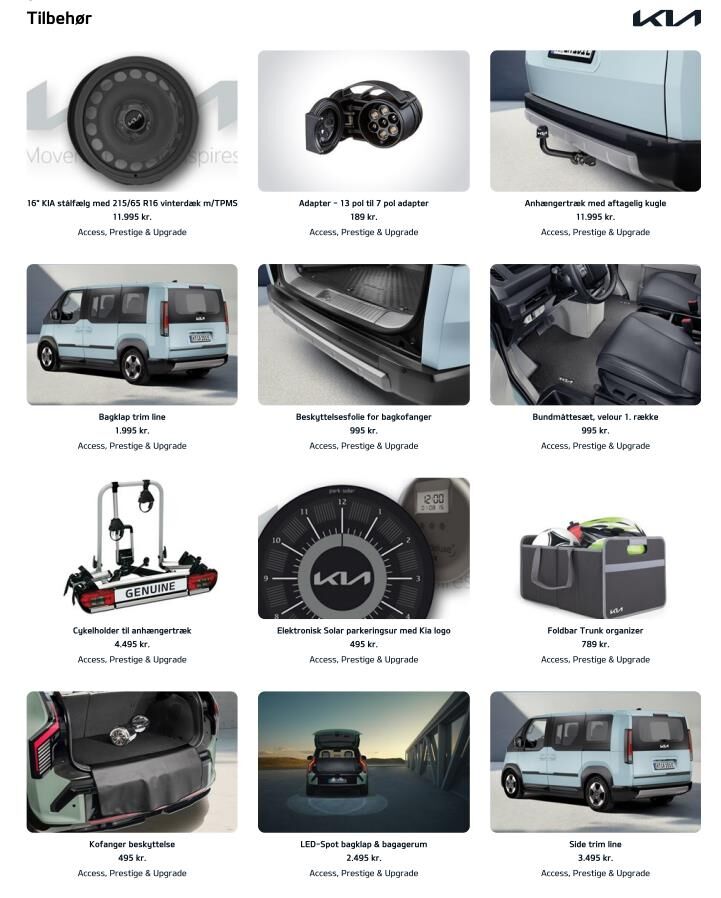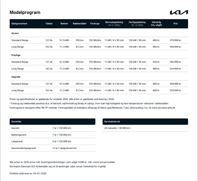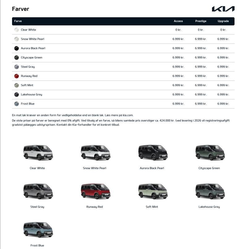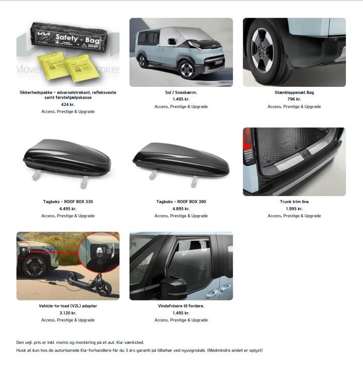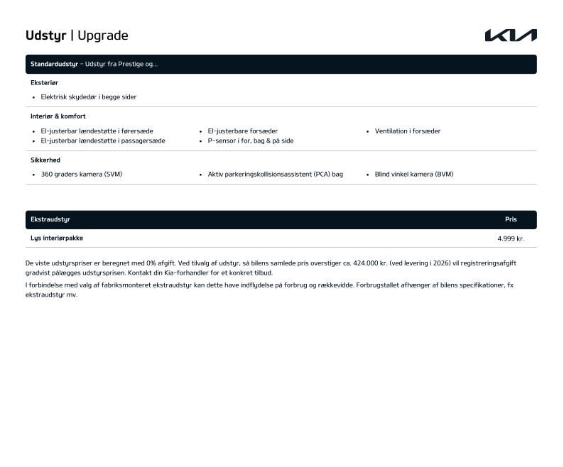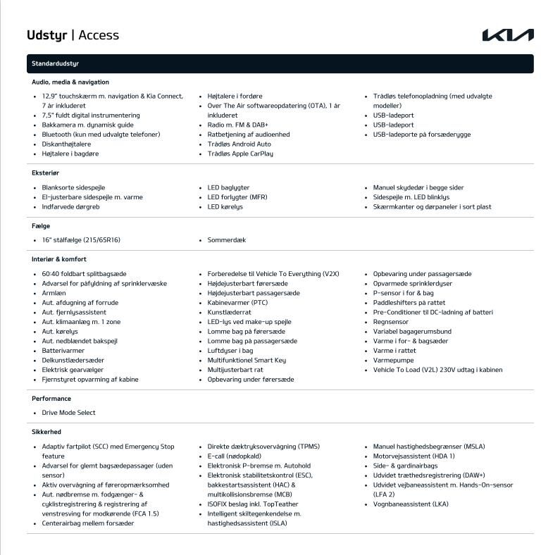 16” Originale Kia Alufælge · 360graders. kamera · Blindvinkelkamera · Aktiv parkeringskollisionsassistent · Varmepumpe · Adaptiv fartpilot (SCC) med Emergency Stop feature & Udvidet motorvejsassistent (HDA 2) · P-sensor i for & bag med 360 graders kamera m. dynamisk guide · El-justerbart førersæde i Kunstlædersæder med Varme i for- & bagsæder · Køl i forsæderne · Højdejusterbart passagersæde · Aut. klimaanlæg m. 1 zoner · El-bagklap & Elektriske skydedøre · Digital Key · 12 ·9” touchskærm m. Bluetooth · Navigation Trådløs Android Auto & Apple Carplay · Kia Connect · 7 år inkluderet · Trådløs telefonopladning (med udvalgte modeller) · 7 ·5” fuldt digital instrumentering · LED forlygter (projektion) med LED Kørelys · Baglygter & Aut. Kørelys · Multifunktionel Smart Key · El-foldbare sidespejle med varme · Multijusterbart Kunstlæderrat med Varme · Batterivarmer · Justerbart armlæn · Aut. nedblændet bakspejl · Luftdyser i bag · Regnsensor · Elektronisk P-bremse m. Autohold · Aktiv overvågning af føreropmærksomhed · Elektronisk stabilitetskontrol (ESC) · bakkestartsassistent (HAC) & multikollisionsbremse (MCB) · Vognbaneassistent (LKA) · Intelligent skiltegenkendelse m. hastighedsassistent (ISLA) · Aktiv blindvinkelassistent (BCA) & assistent for bagvedkrydsende trafik (RCCA) · Udvidet vejbaneassistent m. Hands-On-sensor (LFA 2) · USB-ladeporte · Over The Air softwareopdatering (OTA) · 1 år inkluderet · 11 kW onboard charger uden V2X · El-ruder i for · Aut. afdugning af forrudeAdvarsel for glemt bagsædepassager (uden sensor) · Direkte dæktryksovervågning (TPMS) · Aut. nødbremse m. fodgænger- & cyklistregistrering & registrering af venstresving for modkørende & krydsende trafik (FCA 2.0)
